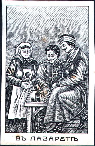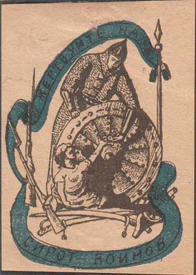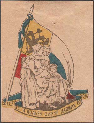 1916 г. 03.-04.09.1916 г. 1916 г. (03.-04.09.1916 г.). Разм. 50 х 67 мм. Двухцветная печать на желтоватой бумаге. Русский воин в доспехах со щитом и ребенок. Внизу различное оружие. На ленте текст: «Жертвуйте на сирот воинов».