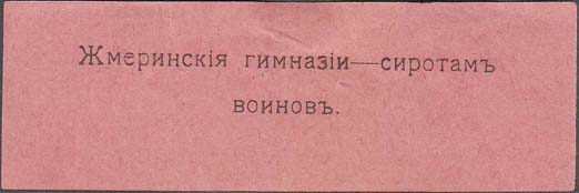 1915(?) г. Разм. 88 х 29 мм. Одноцветная печать на бумаге различных цветов. В центре текст в две строки: «Жмеринские гимназии – сиротам воинов».