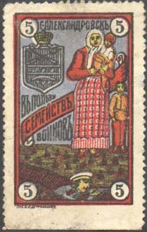 1905 г. Разм. рамки 28 х 45 мм. Многоцветная печать на белой бумаге. Зубц. 11 1/2. С клеем. В двойной прямоугольной рамке в центре справа женщина с двумя детьми, внизу солдат в окопе. В левом верхнем углу герб г. Запорожье. Сверху текст: «г. Александровск». В центре слева продолжение текста в три…