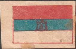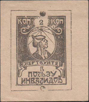 1915(?) г. Разм. 26 х 43 мм. Двухцветная печать на тонкой желтоватой бумаге. Виньетка в виде флага Сер-бии. Текст в две строки: «В пользу Сербского Красного Креста».