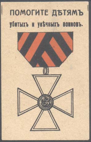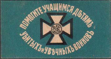 1915(?) г. Разм. 60 х 31 мм. Двухцветная печать на белой бумаге. В центре Георгиевский крест. Сверху полукругом текст: «Помогите учащимся детям». Внизу продолжение текста: «Убитых и увечных воинов».