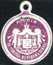 1915(?) г. Ромб разм. 39 х 39 мм. Одноцветная и двухцветная печать на белой бумаге. В центре медаль с гербами стран-союзниц России в Первой мировой войне. Сверху название страны. Внизу под гербом, кроме знаков с гербом России, полукругом текст: «На помощь жертвам войны».