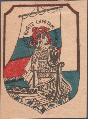 1916 г. 03.-04.09.1916 г. Разм. 51 х 67 мм. Трехцветная печать на жел-товатой бумаге. В центре русский воин в доспехах плывет на ладье с парусом цветов российского флага. На парусе монограмма из букв «О», «П» и «П» и текст: «Жертвуйте сиротам войны». На бортах ладьи текст: «Клич».