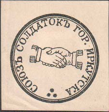 1917 г. 20.-21.08.1917 г. Разм. 38 х 39 мм. Одноцветная печать на белой бумаге. В центре в двойной круглой рамке диаметром 31 мм две руки, сцепленные в рукопожатии. По внутреннему периметру рамки текст: «Союз солдаток гор. Иркутска». Внизу декоративные элементы.