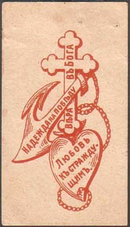 1916 г. 25.05.1916 г. Разм. 30 х 53 мм. Одноцветная печать на тол-стой желтоватой бумаге. Эмблема общества: крест, якорь, сердце и девиз: «Вера в Бога, Надежда на победу, Любовь к страждущим».