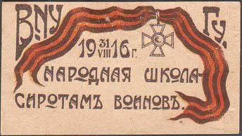 1916 г. 31.08.1916 Разм. 62 х 32 мм. Трехцветная печать на желтоватой бумаге. Справа Георгиевская лента. В левом верхнем углу два венка с аб-бревиатурами «ВНУ» и «ГУ» и дата: «1916 г.». Сверху текст в две строки: «Народная школа». Внизу продолжение текста: «Сиротам воинов».