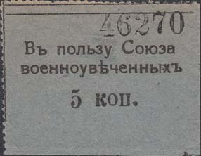 1917 г. 21.09.1917 Разм. по перфорации 49 х 30 мм. Одноцветная печать на серо-голубой бумаге. Зубц. 11 1/2. Текст в две строки: «В пользу Союза военноувеченых». Внизу номинал. Поверх текста контрольный номер, проставленный нумератором.