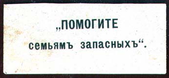 1915(?) г. Разм. 56 х 24 мм. Одноцветная печать на серо-зеленой бумаге. В центре текст в две строки: ««Помогите семьям запасных»».