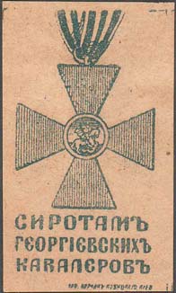 1915(?) г. Разм. 32 х 54 мм. Одноцветная печать на желто-серой бумаге. В центре Георгиевский крест на ленте. Внизу текст в три строки: «Сиротам Георгиевских кавалеров». Справа внизу мелким шрифтом выходные данные неразборчиво.