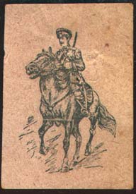 1915(?) г. Разм. 31 х 44 мм. Одноцветная печать на серой бумаге. В центре кавалерист на лошади.
