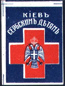 1916 г. 10.10.1916 г. Разм. 35 х 47 мм. Двухцветная печать на толстой белой бумаге. В центре герб Сербии на фоне красного креста. Сверху текст в две строки: «Киев сербским детям». По углам знака разграничительные линии.