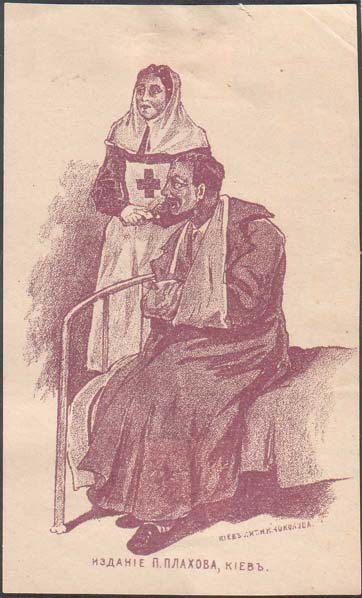 1916(?) г. Разм. 61 х 99 мм. Одноцветная печать на кремовой бумаге. В центре сестра милосердия и раненый солдат, сидящий на кровати. Внизу текст: «Издание П.Плахова, Киев». Справа внизу мелким шрифтом выходные данные: «Киев, Лит. Н.А.Чоколова».