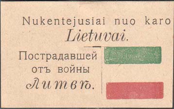 1917 г. 08.10.1917 г. Разм. 60 х 37 мм. Трехцветная печать на белой бумаге. Слева текст в три строки: «Пострадавшей от войны Литве». Справа флаг Литвы. Сверху текст в две строки на литовском языке.