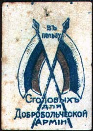 1919(?) г. Разм. 31 х 44 мм. Двухцветная печать на желтоватой бумаге. В центре два скрещенных российских флага. Сверху текст в две строки: «В пользу». Внизу продолжение текста в четыре строки: «Столовых для Добровольческой Армии».