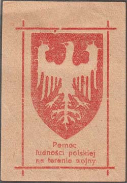 1917(?) г. Разм. 50 х 71 мм. Одноцветная печать на тонкой желтоватой бумаге. В прямоугольной разм. 35 х 56 мм щиток с гербом Польши. Внизу текст в три строки на польском языке: «Помощь польскому населению на территории, пострадавшей от войны(?)».