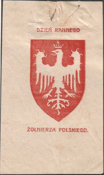 1917(?) г. Разм. 58 х 96 мм. Одноцветная печать на желтоватой бумаге. В центре на фоне щитка сложной формы одноглавый орел. Сверху текст на польском языке: «День раненого». Внизу продолжение текста на польском языке: «Польского солдата».