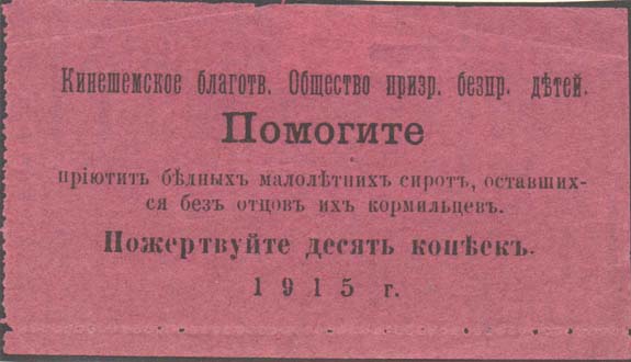 1915 г. Квитанция разм. 96 х 56 мм. Одноцветная печать на темно-красной бумаге. Левосторонняя зубц. 11. В центре текст в шесть строк: «Кинешемское благотв[орительное]. Общество призр[ения]. беспр[изорных]. детей. Помогите приютить бедных маленьких сирот, оставшихся без отцов их кормильцев. Пожерт…