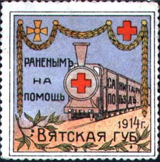 1914 г. Разм. 40 х 40 мм. Многоцветная печать на белой бумаге. Зубц. 11 1/2. С клеем. В двойной прямоугольной рамке в центре санитарный поезд. Сверху гирлянда. Слева текст в три строки: ««Раненым на помощь». Внизу текст в две строки: «1914 г. Вятская губ[ерния].».