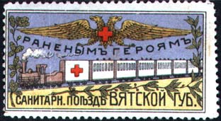 1914 г. Разм. рамки 48 х 24 мм. Многоцветная печать на белой бумаге. Зубц. 11 1/2. С клеем. В двойной прямоугольной рамке в центре санитарный поезд. Сверху двухглавый орел с красным крестом на груди и текст: «Раненым героям». Внизу текст: «Санитарн[ый]. поезд Вятской губ[ернии].».