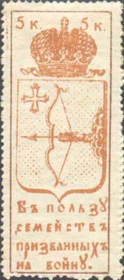 1915 г. Разм. рамки 25 х 64 мм. Двухцветная и трехцветная печать на белой бумаге. Зубц. 11 1/2. С клеем. В прямоугольной рамке в центре герб Вятской губернии. Сверху в углах номинал. Внизу текст в четыре строки: «В пользу семейств призванных на войну».