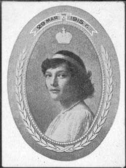 1915 г. 29.05.1915 г. Всероссийский сбор. Разм. 42,5 х 57 мм. Одноцветная печать на белой бумаге. В овальной декоративной рамке в центре портрет Великой Княжны Татьяны Николаевны. Сверху на ленте да-та: «29 мая 1915 года».