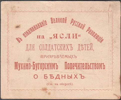 1917 г. Разм. 81 х 66 мм. Одноцветная двухсторонняя печать на гладкой желтоватой бумаге. На лице-вой стороне в прямоугольной декоративной рамке разм. 71 х 53 мм текст в семь строк: «В ознаменование Великой Русской Революции на «Ясли» для солдатских детей, призреваемых Мухино-Бугорским Попечительс…