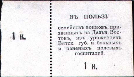 1905 г. Листок из квитанционной книжки разм. 86 х 44 мм. Одноцветная печать на сероватой бумаге. Левостороння зубц. 11 1/2. На квитанции в центре текст в семь строк: «В пользу семейств воинов, призванных на Дальн[ий]. Восток, из уроженцев Вятск[ой]. губ[ернии]. и больных и раненых полевых госпита…