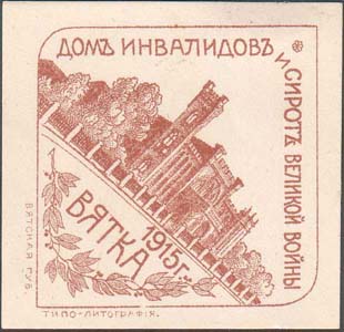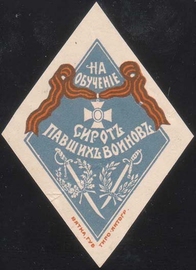 1916 г. 20.05.1916 г. Ромб разм. 48 х 66 мм. Трехцветная печать на белой бумаге. Сверху Георгиевский крест на ленте, внизу две сабли и венки. Текст в четыре строки: «На обучение сирот павших воинов». Внизу под рамкой выходные данные мелким шриф-том: «Вятка, губ. Типо-литогр.».