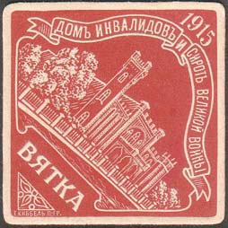 1915 г. 06.11.1915 г. Виньетка в виде ромба разм. 57 х 57 мм. Одноцветная печать с тиснением на белой бумаге. В центре на сплошном фоне изображение дома инвалидов и сирот войны в Вятке. В верхнем углу дата: «1915», ниже на ленте текст: «Дом инвалидов и сирот великой войны». В нижнем углу текст: «В…