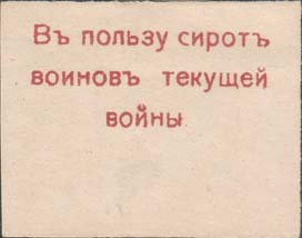 1915(?) г. Разм. 46 х 35 мм. Одноцветная печать на плотной белой бумаге. В центре текст в три строки: «В пользу сирот текущей войны».