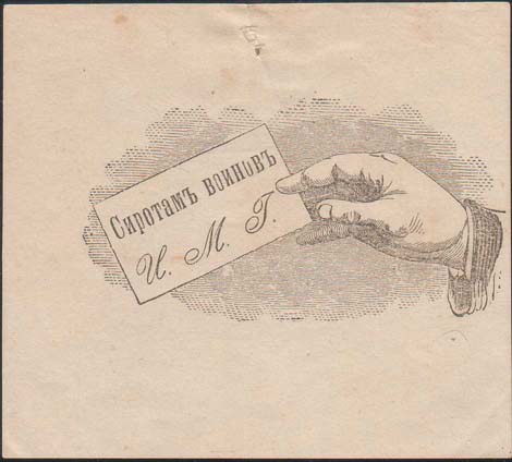1915(?) г. Разм. 79 х 70 мм. Одноцветная печать на белой бумаге. В центре рука, держащая листок с текстом в две строки: «Сиротам воинов И.М.Г.».