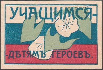 1916 г. Разм. 61 х 42 мм. Трехцветная печать на белой бумаге. В прямоугольной рамке разм. 55 х 35 мм в центре на фоне российского флага цветы и текст в две строки: «Учащиеся - детям героев».