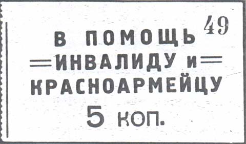 1928 г. Квитанция разм. 43 х 75 мм. Одноцветная печать на белой бумаге. Левосторонняя зубц. 11 1/2. В центре текст в три строки: «В помощь инвалиду и красноармейцу». Ниже номинал. В правом верхнем углу номер, проставленный нумератором.