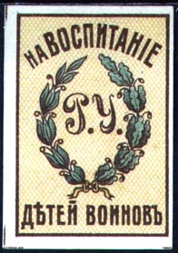 1915(?) г. Разм. рамки 28 х 41,5 мм. Трехцветная печать на белой бумаге. В прямоугольной рамке на сетчатом фоне в центре аббревиатура: «Р.У.» в обрамлении венка. Сверху полукругом текст: «На воспитание». Внизу продолжение текста: «Детей воинов».