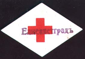 1915(?) г. Ромб разм. 46 х 30 мм. Одноцветная печать на белой бумаге. В центре красный крест. Сверху фиолетовая надпечатка ручным каучуковым штампом текста: «Елизаветград».