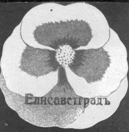 1915(?) г. Виньетка сложной формы в виде цветка разм. ≈ 44 х 43 мм. Трехцветная печать на белой бумаге. Внизу фиолетовая надпечатка ручным каучуковым штампом текста: «Елисаветград».