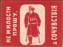 1915(?) г. Разм. 43 х 33 мм. Одноцветная печать на белой бумаге. В центре инвалид войны на костылях. Слева вертикально снизу вверх текст в две строки: «Не милости прошу,». Справа вертикально снизу вверх продолжение текста: «А сочувствия».