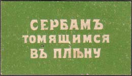 1916(?) г. Разм. 41 х 25 мм. Одноцветная печать на белой бумаге. В центре на сплошном фоне текст в три строки: «Сербам томящимся в плену».