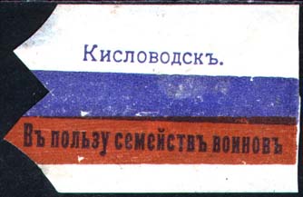 1915(?) г. Разм. 60 х 36 мм. Двухцветная печать на белой бумаге. Виньетка в виде флага России. Текст в две строки: «Кисловодск. В пользу семейств воинов».