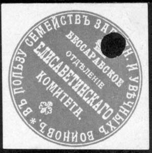 1915(?) г. Ромб разм. 57 х 57 мм. Одноцветная печать на белой бумаге. В круглой рамке диаметром 37 мм в центре на сплошном фоне текст в четыре строки: «Бессарабское отделение Елизаветинского комитета». Сверху императорская корона, внизу декоративный элемент. По внутреннему периметру рамки текст: …