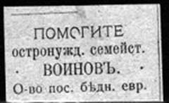 1917 г. Разм. 42 х 26 мм. Одноцветная печать на бумаге различных цветов. В центре текст в четыре строки: «Помогите остронужд[ающимся]. се-мейст[вам]. воинов. О-во пос[обия]. бедн[ым]. евр[еям].».