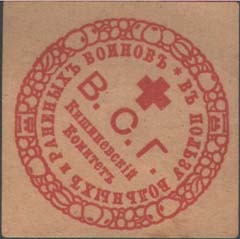 1915(?) г. Ромб разм. 40 х 40 мм. Одноцветная печать на сероватой бумаге. В декоративной круглой рамке с растительным орнаментом в центре текст в три строки: «В.С.Г. Кишиневский Комитет». Сверху красный крест. По внутреннему периметру рамки текст: «В пользу больных и раненых воинов».