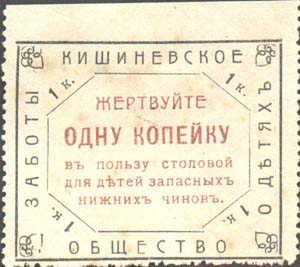 1914(?) г. Разм. рамки 44 х 32 мм. Двухцветная печать на белой бумаге. Зубц. 11 1/2. В прямоугольной рамке в центре дополнительная восьмиугольная рамка. В восьмиугольной рамке в центре текст в пять строк: «Жертвуйте одну копейку в пользу столовой для детей запасных нижних чинов». По периметру меж…