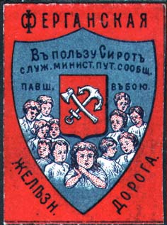 1916 г. 17.09.1916 г. Всероссийский сбор. Разм. 38 х 52 мм. Трехцветная печать на белой бумаге. В центре на сплошном фоне в рамке в виде фигурного щитка группа детей и путейский значок. Сверху текст в три строки: «В пользу Сирот служ[ащих]. минист[ерства]. пут[ей]. сообщ[ения]. Павш[их]. в бою». П…