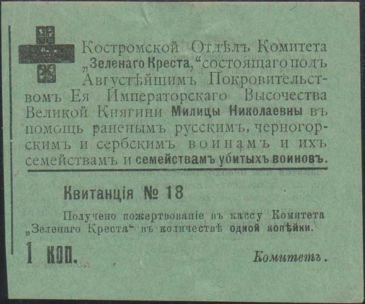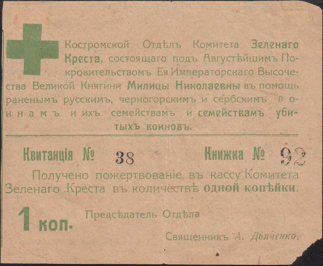 1914(?) г. Квитанция разм. ≈ 108 х 88 мм. Одноцветная двухсторонняя печать на тонкой сероватой бумаге. На лицевой стороне в левом верхнем углу знак Зеленого Креста. Сверху над горизонтальной чертой текст: «Костромской Отдел Комитета Зеленого Креста, состоящего под Августейшим Покровительством Ее …