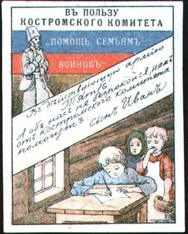 1916(?) г. Разм. рамки 39 х 53 мм. Многоцветная печать на плотной белой бумаге. Сверху солдат в зимнем обмундировании на фоне российского флага. На флаге текст в четыре строки: «В пользу Костромского комитета «Помощь семьям воинов»». Внизу трое детей, один из которых пишет письмо, сидя за столом…