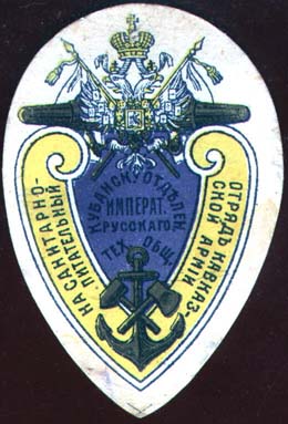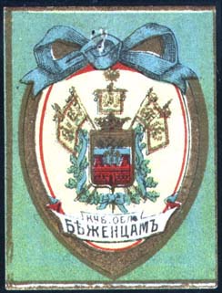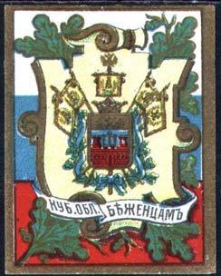 1915(?) г. Разм. 39 х 52 мм. Многоцветная печать на белой бумаге. В центре на фигурном щитке герб Кубанского казачьего войска. Внизу на ленте текст: «Куб[анская]. Обл[асть]. беженцам».