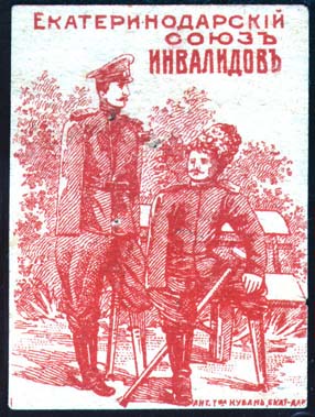 1916(?) г. Разм. 45 х 62 мм. Одноцветная печать на желтоватой бумаге. В центре два инвалида на скамейке на фоне деревьев. Сверху текст в три строки: «Екатеринодарский союз инвалидов».