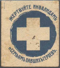 1919(?) г. Разм. 38 х 43 мм. Одноцветная печать на желтоватой бумаге. В центре белый крест на фоне круглой розетки. Сверху и снизу полукругом текст: «Жертвуйте инвалидам и семьям павших героев».