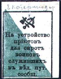 1915(?) г. Разм. рамки 29 х 39 мм. Двухцветная печать на белой бумаге. Поле в внутри рамки поделено по диагонали на две части. Сверху путейский значок. Ниже текст в семь строк: «На устройство приютов для сирот воинов служащих в вед[омстве]. пут[ей]. сообщ[ения].».